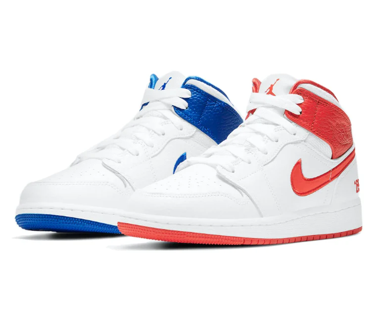 The Iconic Jordan 1 Mid available in in a mismatching Red and Blue on a white base.